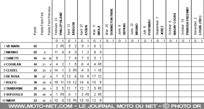 Michael van den Mark et Florian Marino l'accompagnent sur le podium et se partagent dorénavant la première place du classement provisoire avec 65 points chacun. Cluzel termine 15ème de la course italienne et recule à la 5ème place du championnat (42 points) derrière Zanetti (49) et Coghlan (44).
