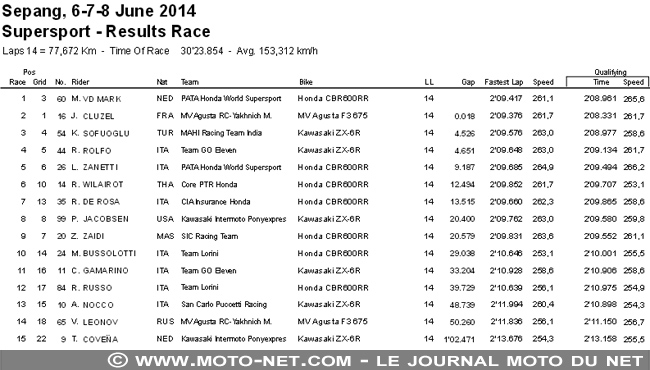 Kenan Sofuoglu grimpe sur le podium juste devant Roberto Rolfo, tandis que Lorenzo Zanetti complète en solitaire le Top 5. Le pilote local Zaqhwan Zaidi (n°20 Honda du Sepang International Circuit Racing Team) entre dans le Top 10 mondial pour sa première participation. Tahniah !